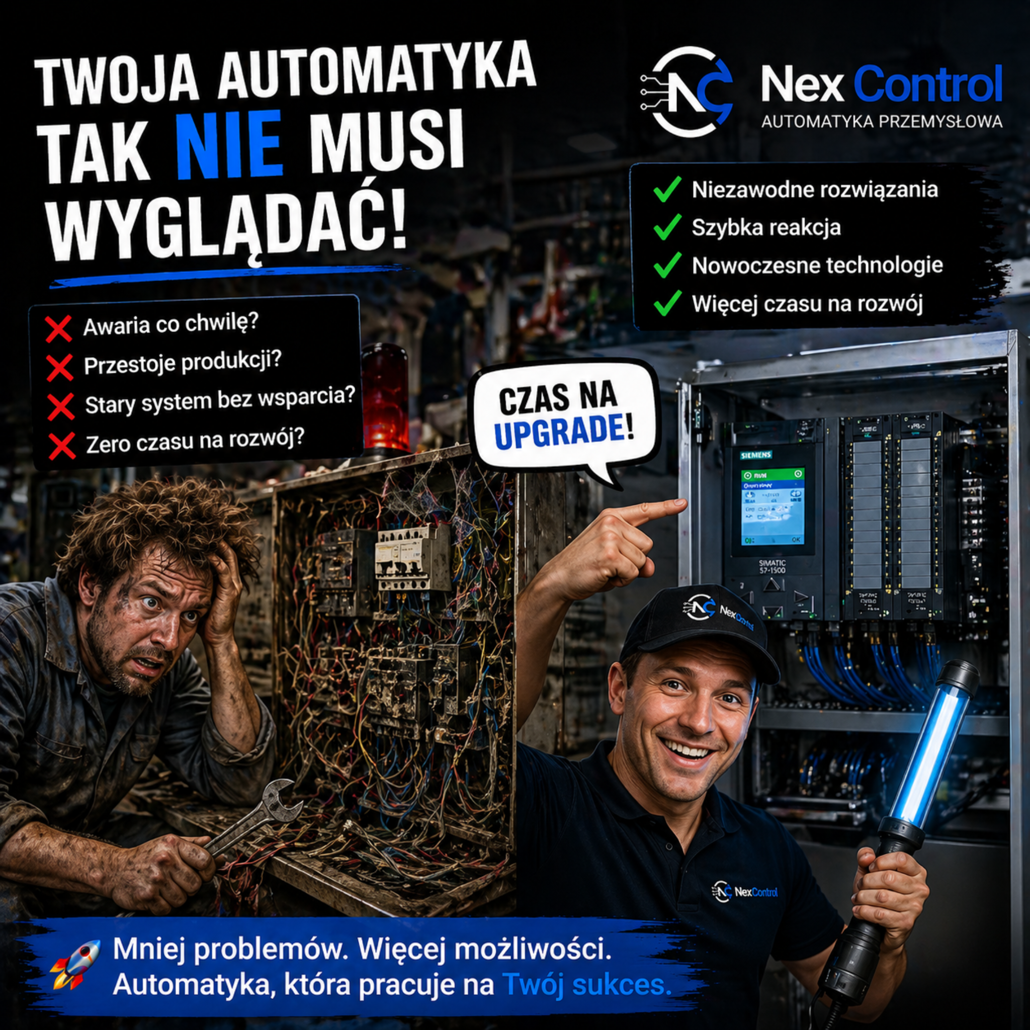 PLC/HMI visuals are blended into dark cards and describe exactly the scope NexControl offers.
